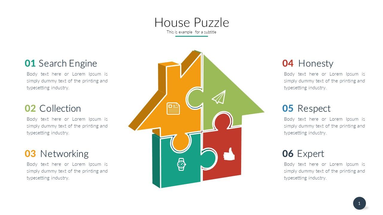 3D Puzzle Diagram PowerPoint Templates is a puzzle piece vectors for PowerPoint in House shape