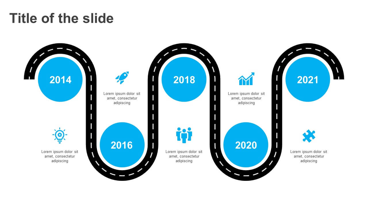 The 5 Steps Curved Roadmap Timeline Template is a horizontal curved timeline. It is an infographic layout to visualize key pieces of information throughout the process workflow