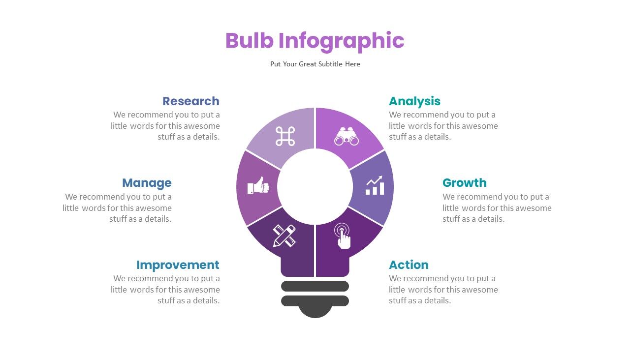 The 6 Step Bulb Diagram PowerPoint Template is a multi-purpose slide. The lightbulb core of slides welcomes the innovative business solutions