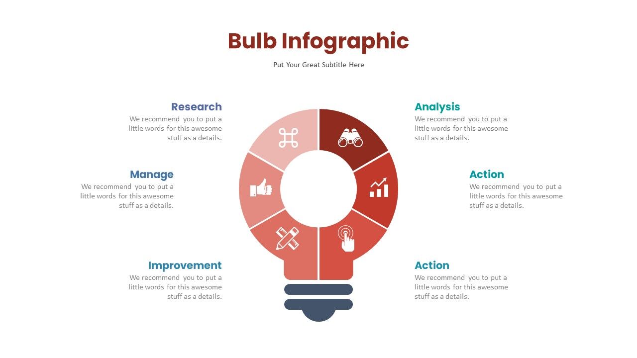 The Light Bulb Infographic PowerPoint Template divides a figure into 6 segments. Each of these segments contains a clipart icon to represent the content of its respective section