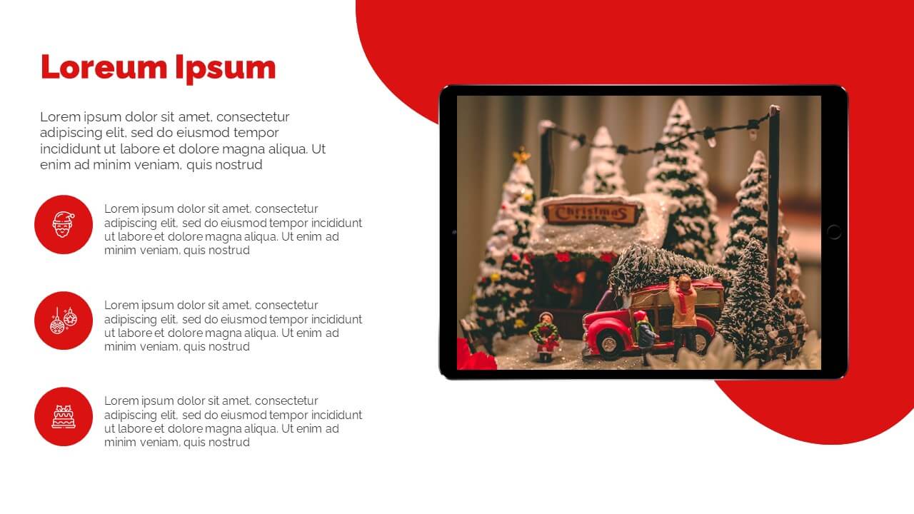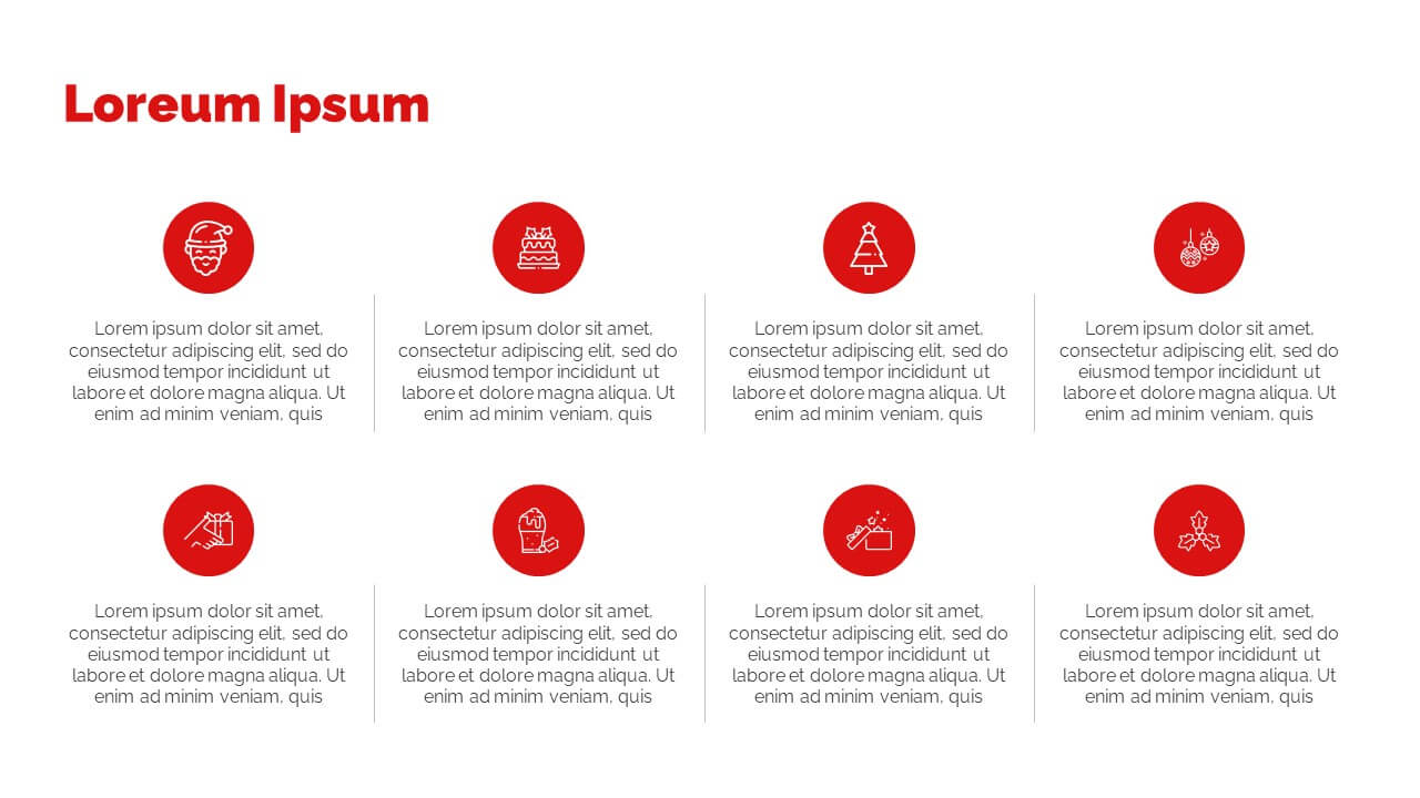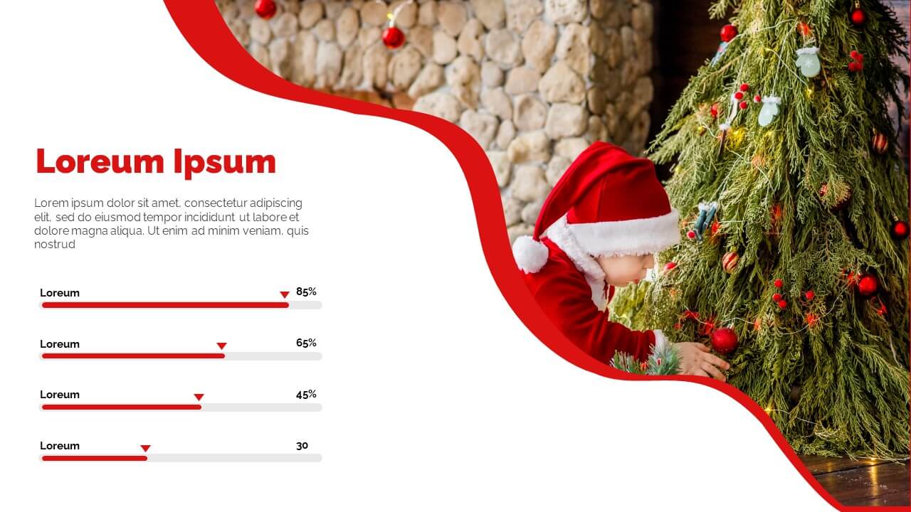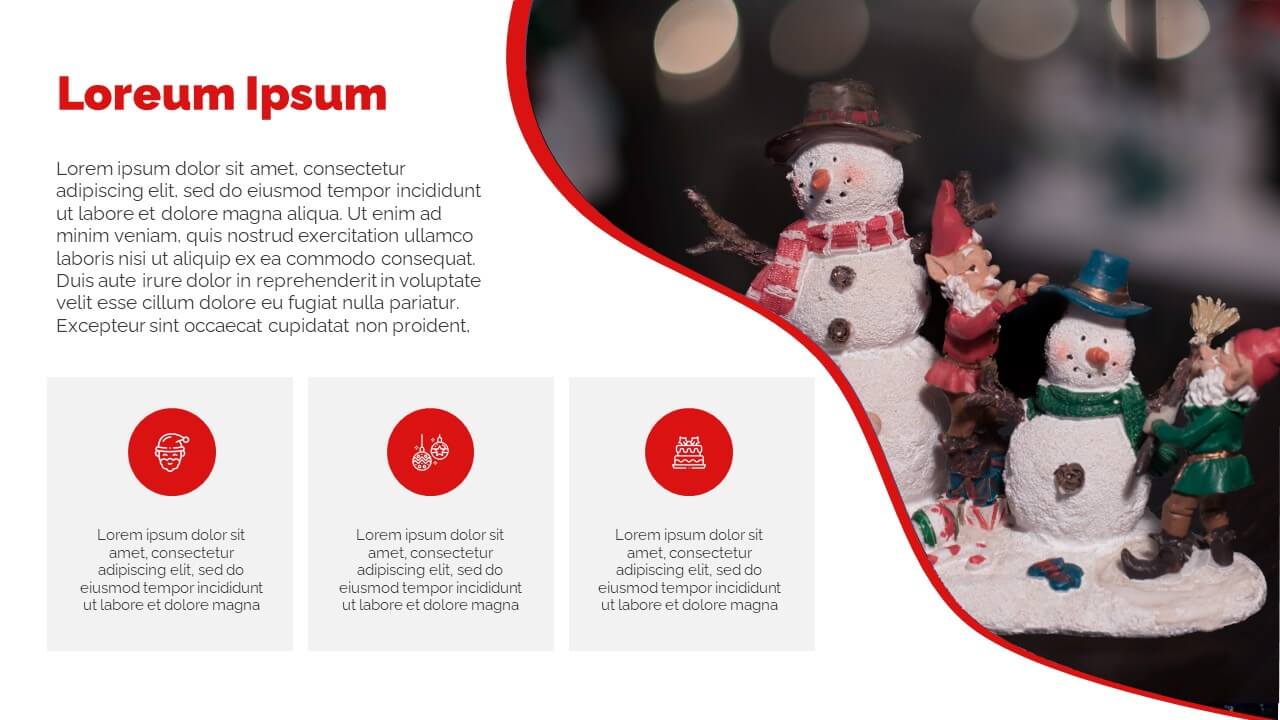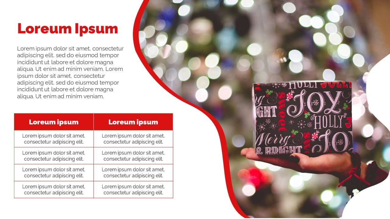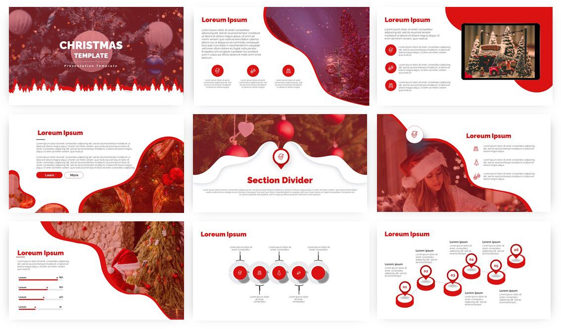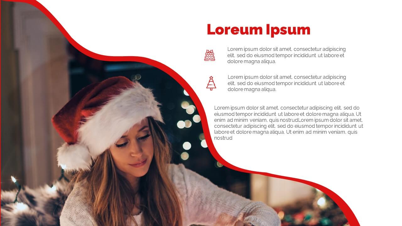 Enjoy this free Powerpoint template for your Christmas presentations. This design uses the perfect color scheme to convey the Christmas mood: red and white.
