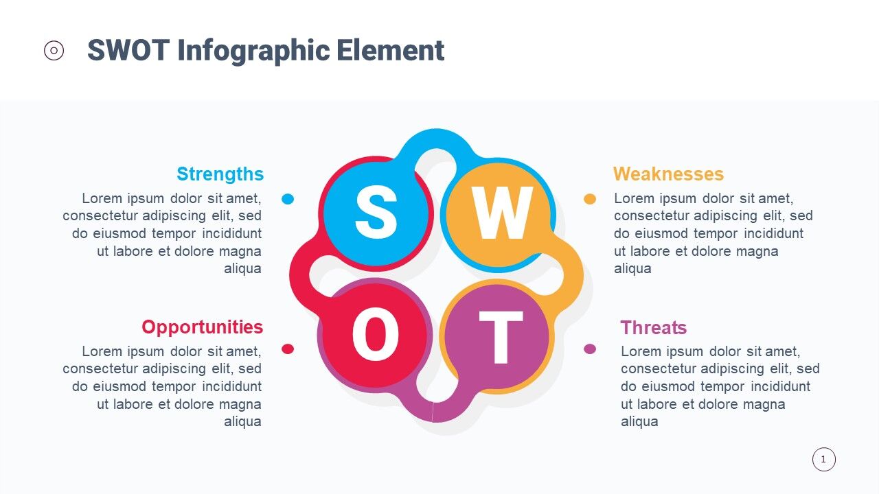 The SWOT Analysis Template Circular Design For PowerPoint is a colorful slide of business and marketing mode
